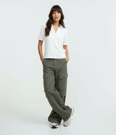 Blusa feminina polo com gola aberta, manga curta em suedine de algodão certificado bci.