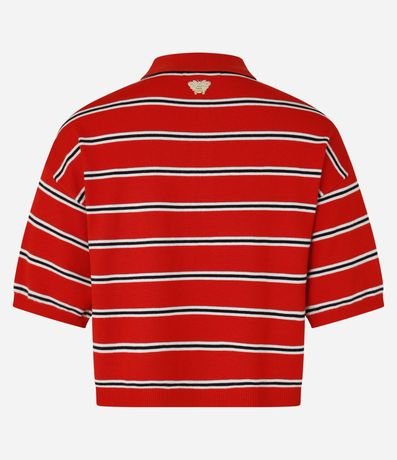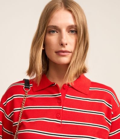 Blusa pólo feminina, confeccionada em tricô, com composição de viscose certificada, abotoamento, mangas curtas e estampa listrada.