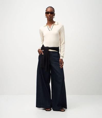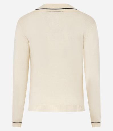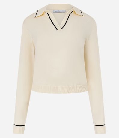 Ref: Blusa feminina confeccionado em tricô. Possui modelo com decote em v, gola polo que acompanha detalhe contrastante, mangas longas e comprimento regular.
