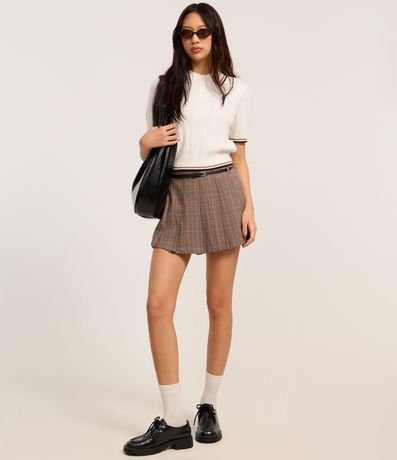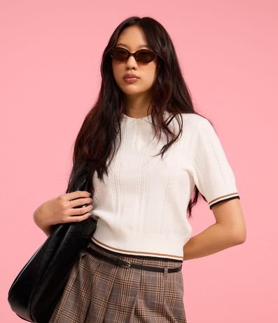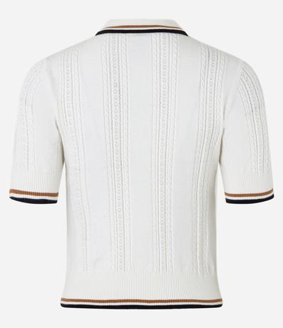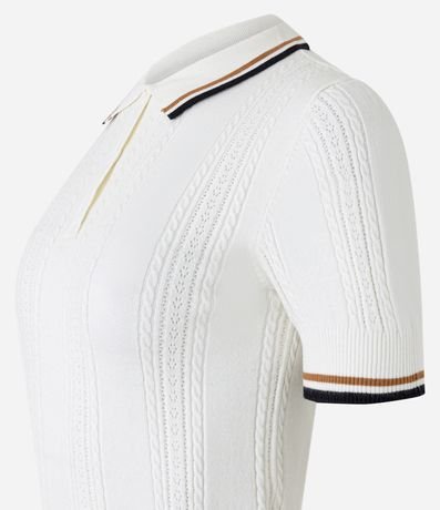 Ref: Blusa polo com mangas curtas, confeccionada em tricô leve, mix de pontos e listras contrastantes na gola, mangas e barra.