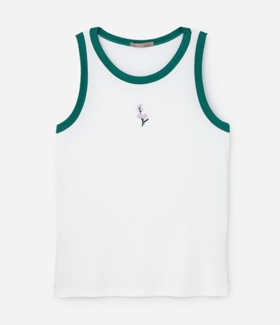 Blusa regata feminina Curve & Plus Size com gola redonda larga contrastante e viés contrastantes, peça confeccionada em ribana de viscose mais sustentável com boas práticas ambientais e estampa bordada de flor centralizada.