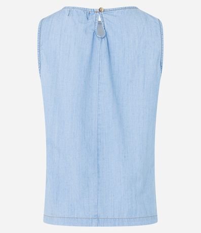 Blusa regata em jeans com recortes e fechamento por botão.