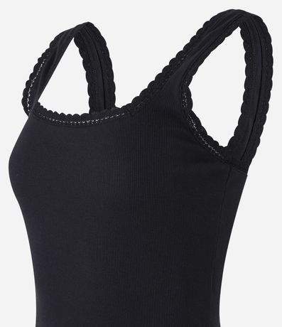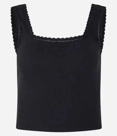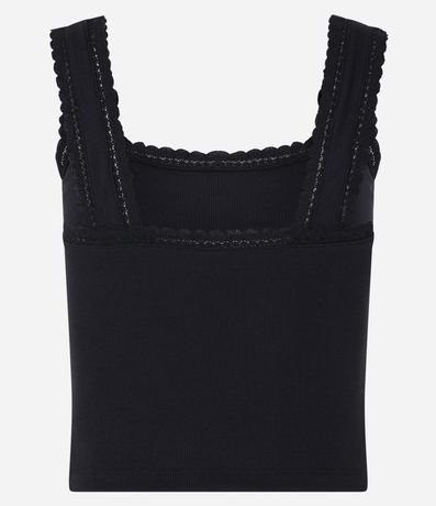 Blusa feminina de modelo regata, confeccionada em malha ribana de algodão, com decote quadrado frontal e nas costas e sem estampa. Possui textura canelada e detalhe de babadinhos nos decotes e cavas.