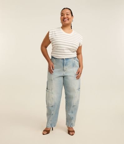 Ref: Blusa plus size feminina confeccionada em malha ribana de algodão, com gola redonda e sem mangas. Possui padronagem de listras finas na horizontal.