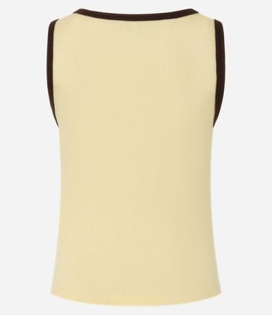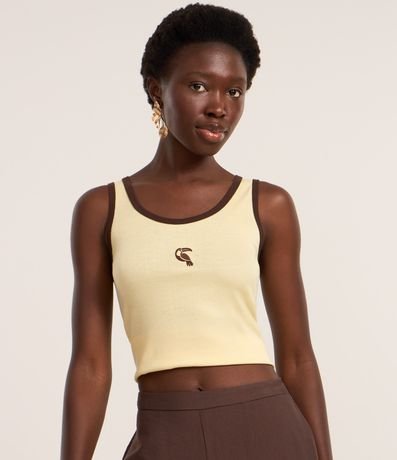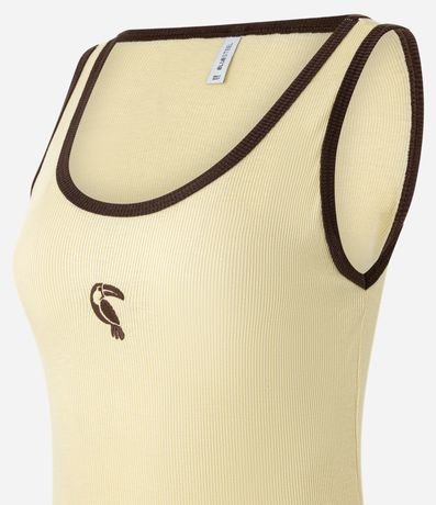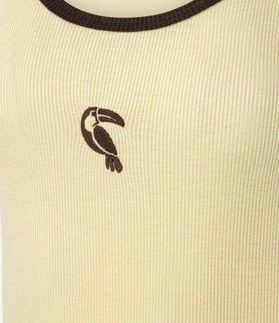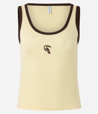 Ref: Blusa feminina regata confeccionada em ribana de algodão certificado bci com boas práticas ambientais, peças com viés contrastantes e estampa bordada de tucano.