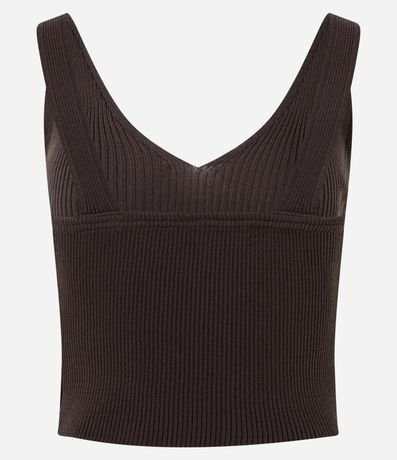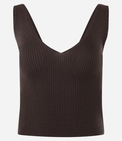 Blusa feminina regata com alças médias, confeccionada em tricô com decote em v e textura listrada.