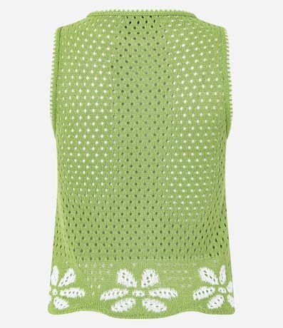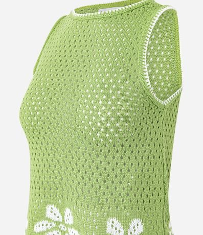 Ref: Blusa regata feminina em tricô com cola redonda, viés contrastantes e florzinhas na barra com babado.