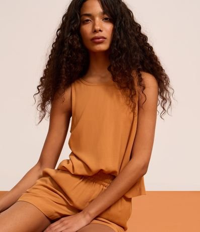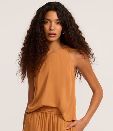 Ref: Blusa feminina confeccionada em chalis mais sustentável, no modelo regular. Possui gola redonda, sem mangas, sem estampa e com fechamento por botão nas costas.