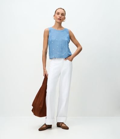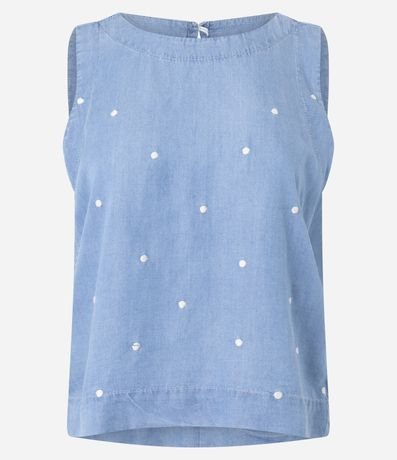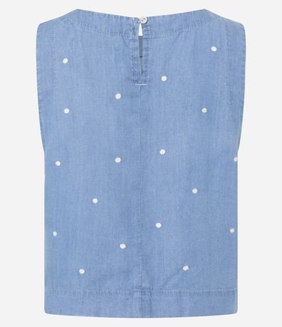 Blusa modelo regular confeccionada em Jeans responsável, oferecendo caimento leve, toque macio e frescor. Possui gola redonda, acabamento sem mangas, bordados poá distribuídos pela superfície e abertura posterior com botão.