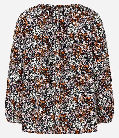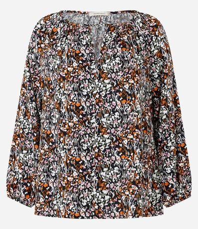 Ref: Blusa feminina confeccionada em sarja mais sustentável através de boas práticas ambientais, no modelo regular. Possui decote v, manga, punhos ajustados e estampa floral.