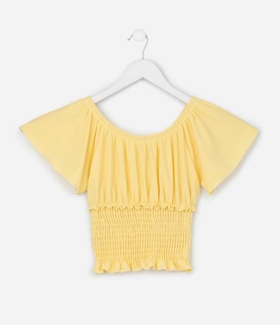 Ref: Blusa infantil confeccionada em cotton através de boas práticas ambientais, no modelo regular. Possui gola redonda, manga curta, sem estampa, texturizada e com lastex na cintura.