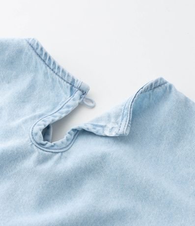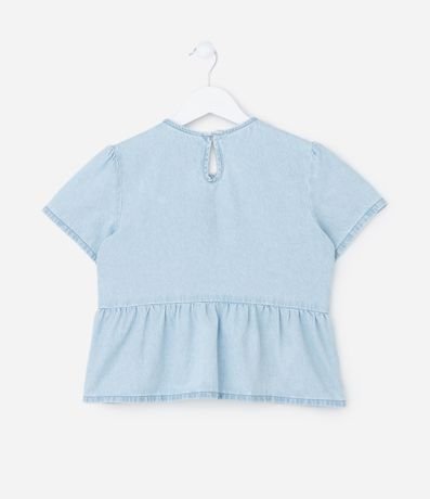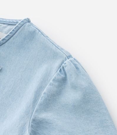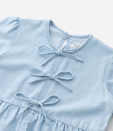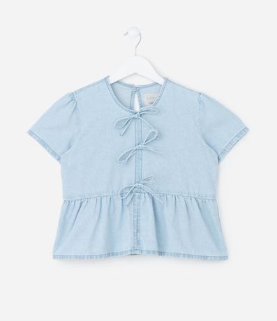 Ref: Blusa infantil confeccionada em jeans mais sustentável, no modelo regular. Possui gola redonda, manga curta, fechamento por botão, gota nas costas, babadinhos e lacinhos frontais.