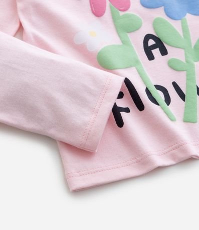 Blusa infantil confeccionada em algodão certificado BCI e boas práticas ambientais, apresentando estampa floral divertida com lettering, manga longa e modelagem relaxed.