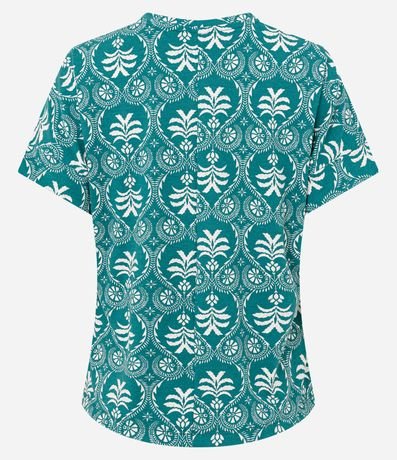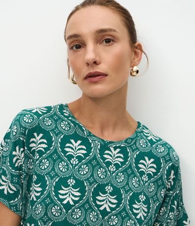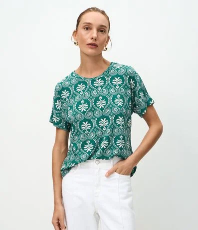 Blusa feminina em viscose mais sustentável com estampa abstrata, modelagem reta e gola redonda. Possui mangas curtas com dobra fixa e costas totalmente estampadas. Tecido leve, macio e ideal para composições casuais do dia a dia.
