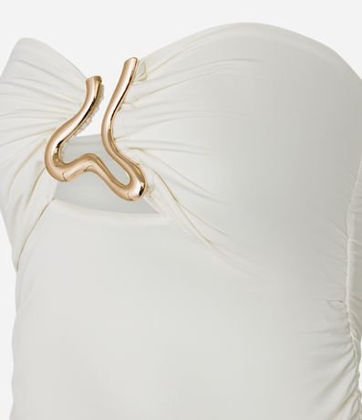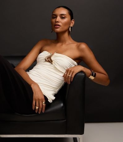 Blusa sem alças, confeccionada em tricô, com decote coração com vazado, aviamento metalizado e franzidos.