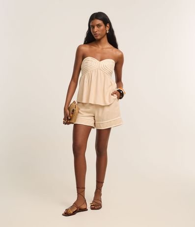 Blusa sem alças, confeccionada em viscolinho com 15% de linho, com decote coração, franzidos e lastex nas costas. A peça tem cordinhas aplicadas no busto. Este produto possui viscose certificada em sua composição, além de ter sido produzido através de processos mais sustentáveis, sendo ambientalmente mais responsável.