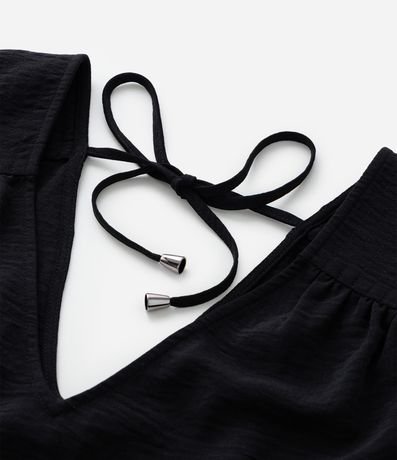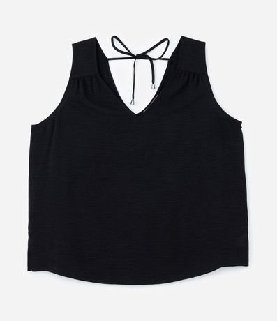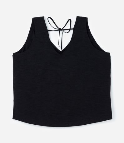 Blusa texturizada, sem estampa, sem mangas, com decote V, alças largas e amarração nas costas.
