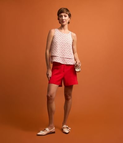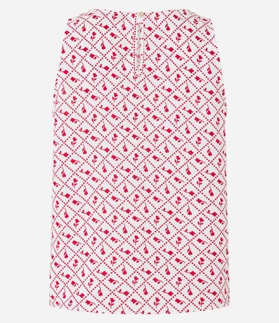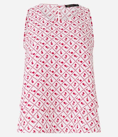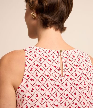 Ref: Blusa sem mangas de alças largas com gola redonda, fechamento dianteiro por gota, sobreposição por camada na barra além de estampa gravataria com padrões de linhas xadrez grid feito por bolinhas com ícones que remetem à flores. Conta com efeito airflow que confere um visual elegantemente amassado.