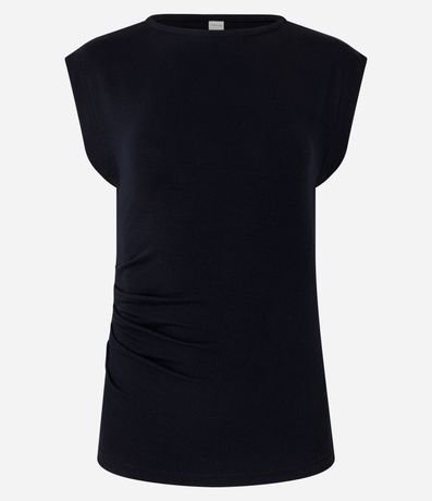Blusa sem mangas confeccionada em algodão com decote canoa e franzidos na lateral.