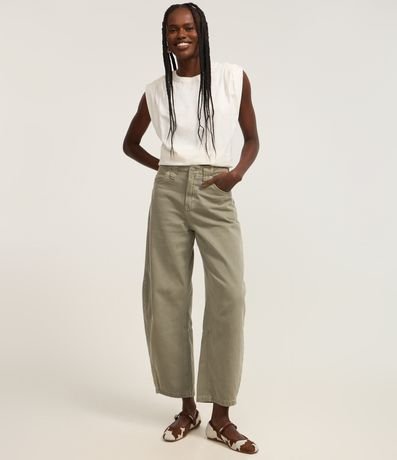 Blusa feminina, confeccionada em algodão, com gola redonda, sem mangas, detalhe franzido nos ombros e superfície sem estampa.
