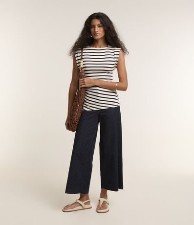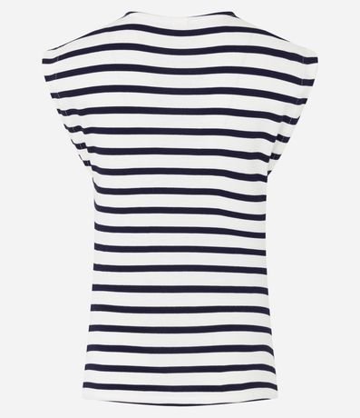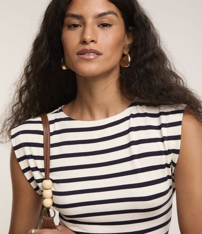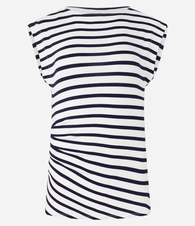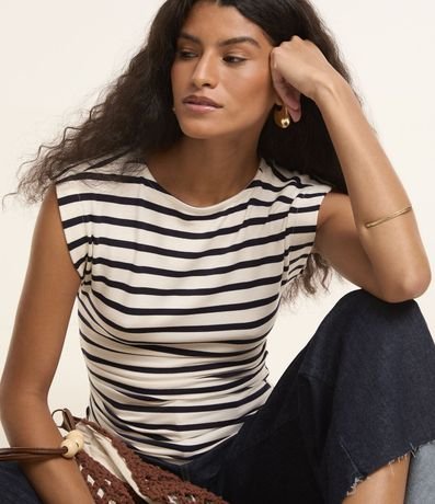 Ref: Blusa sem mangas confeccionada em viscose com decote canoa, franzido lateral e linhas horizontais.