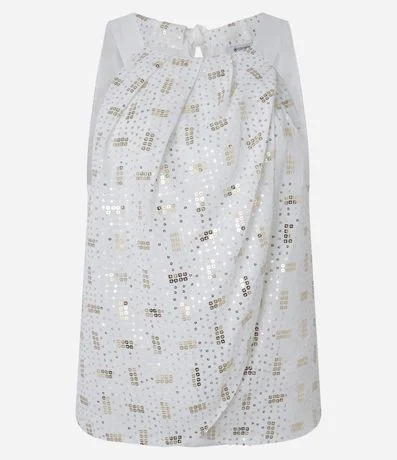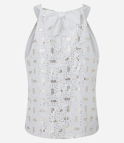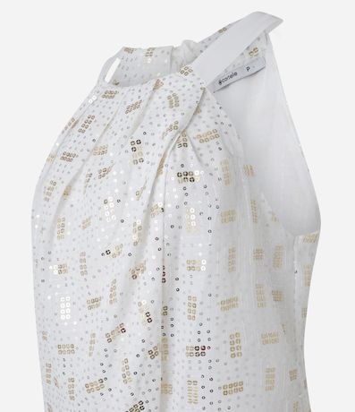 Ref: Blusa sem manga em chiffon, com decote gola americana e bordado de paetê dourado.