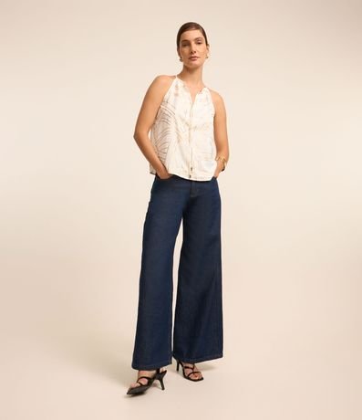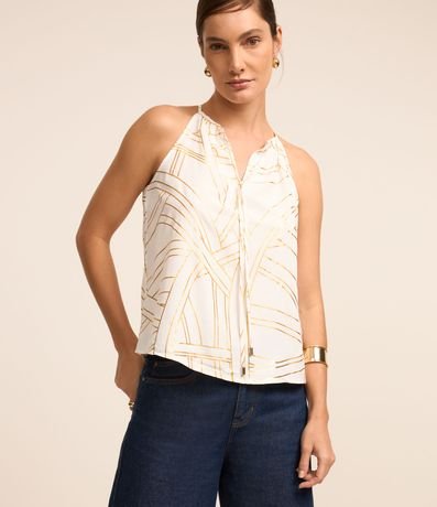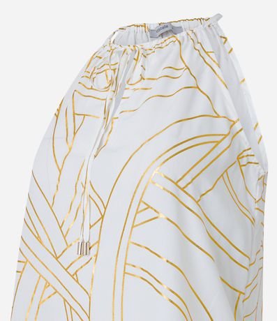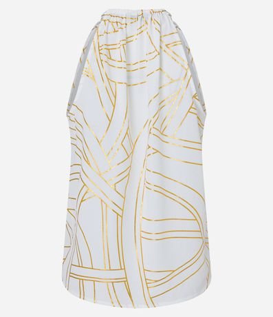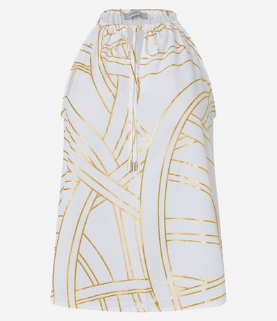 Ref: Blusa sem mangas com gola redonda com elástico e amarração e cavas americanas. Possui estampa abstrata com formas geométricas com detalhes de foil (efeito metalizado). Confeccionada em crepe.