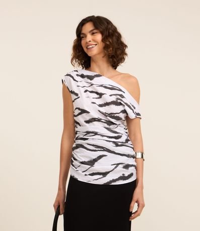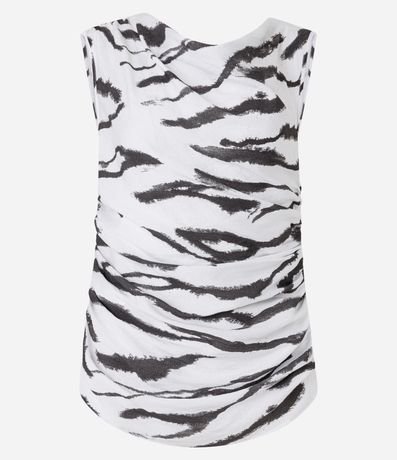Ref: Blusa sem manga, confeccionada em crepe com boas práticas ambientais, estampa animal print zebra e franzidinhos na lateral.