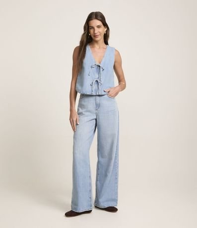 Ref: Blusa feminina em jeans, sem mangas com decote em v e fechamento frontal por lacinhos.