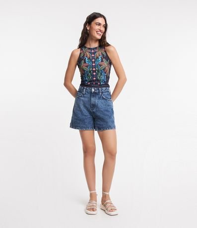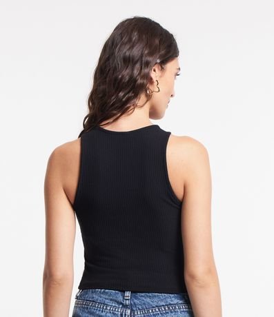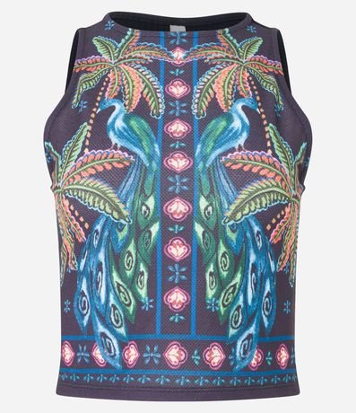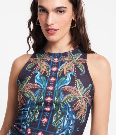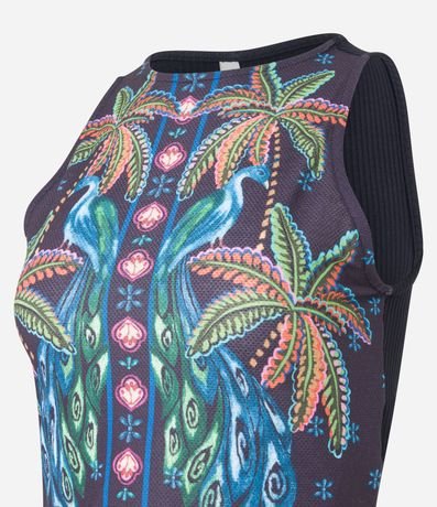 Ref: Blusa sem manga, confeccionada em ribana e com estampa frontal de coqueiros.