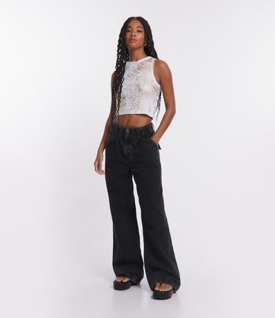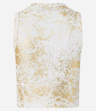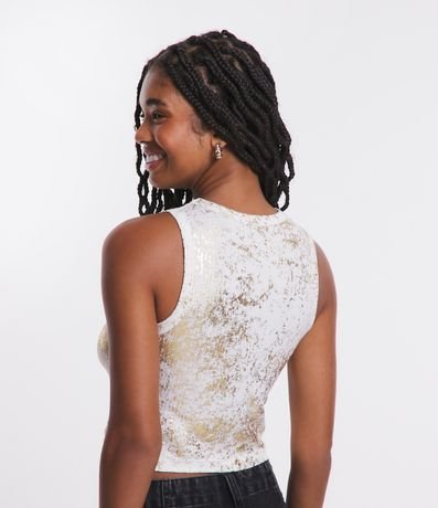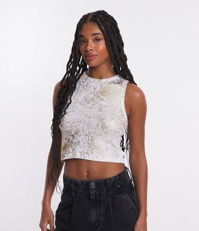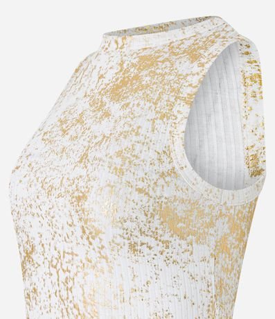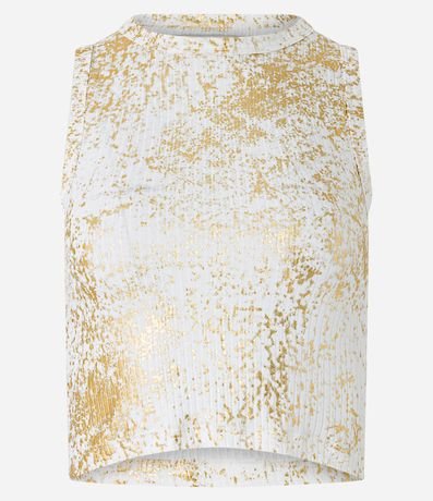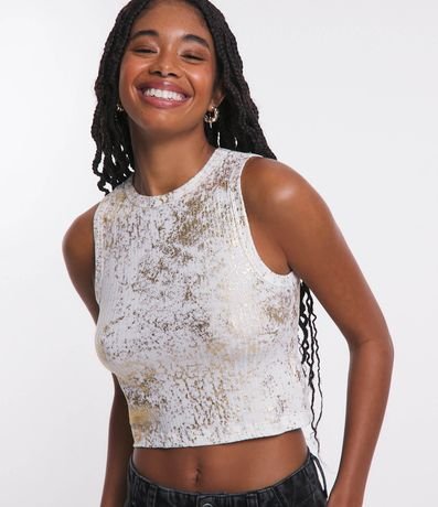 Ref: Blusa cropped sem mangas em ribana com gola redonda, foil metalizado e textura listrada.