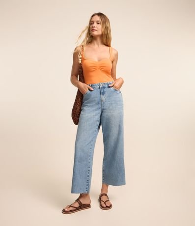 Blusa sem mangas com decote quadrado e franzidos no busto e textura canelada. Confeccionado em ribana de viscose mais sustentável. Possui modelagem ajustada.