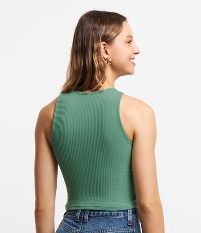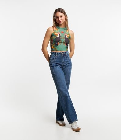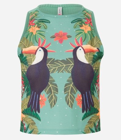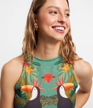 Blusa sem mangas confeccionada em ribana com tucanos e folhagens estampados.