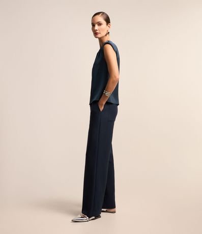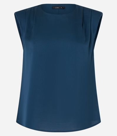 Blusa feminina, confeccionada em tecido acetinado, com gola redonda, alças largas, detalhe de pregas no ombros e superfície sem estampa.