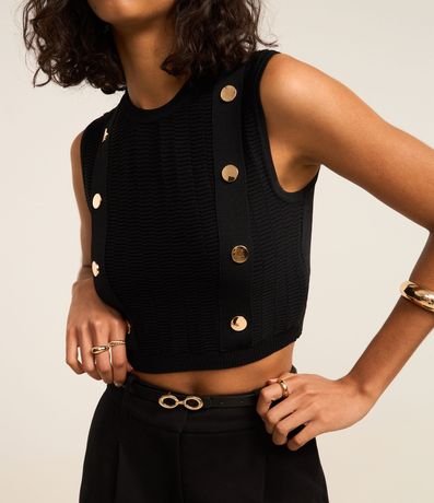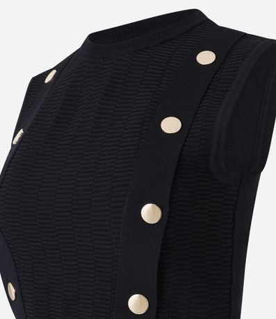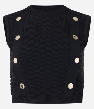 Ref: Blusa sem manga confeccionada em tricô leve cm viscose certificada, detalhe em faixas frontais e botões aplicados.