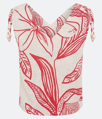 Blusa sem mangas em viscolinho com decote V e amarrações nos ombros com miçangas em formatos geométricos. Conta com folhagens estampadas.