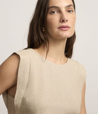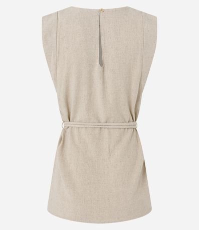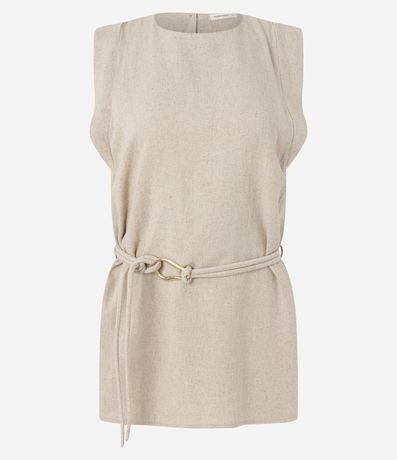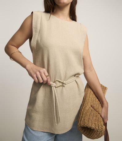 Ref: Blusa feminina confeccionada em viscolinho, gola redonda, sem mangas, cós com passante e um cinto fino com amarração e fivela diferenciada na cintura. Peça com detalhe de recortes nas costas com fechamento por botão.