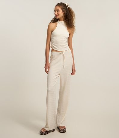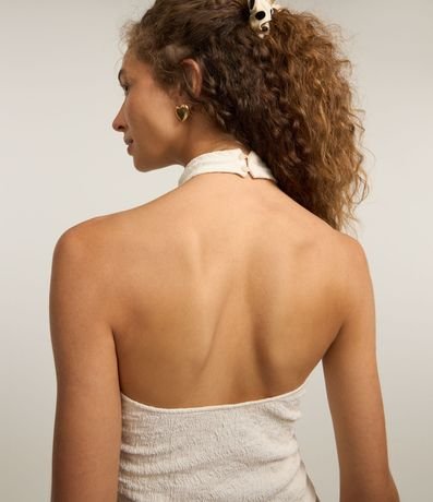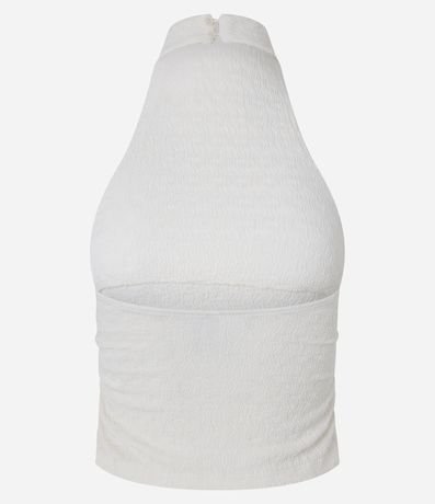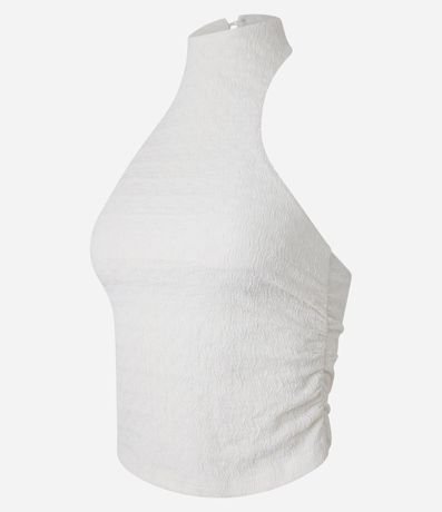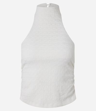 Ref: Blusa frente única com fechamento por botão no pescoço, texturizada e com franzidinho lateral.