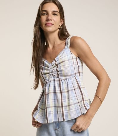 Blusa feminina sem manga em tricoline com estampa xadrez. Possui alças em elástico e drapeado no peito.