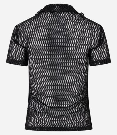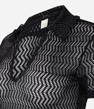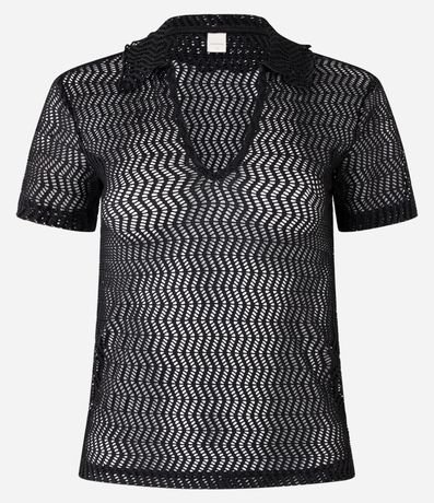 Ref: Blusa slim de mangas curtas, confeccionada em algodão com efeito macramê, com gola polo e textura com furos.
