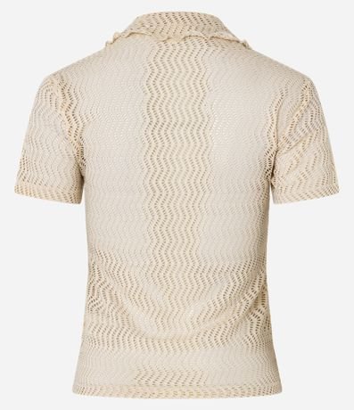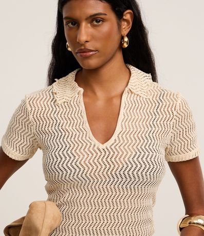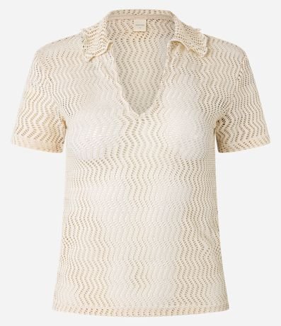 Ref: Blusa slim de mangas curtas, confeccionada em algodão com efeito macramê, com gola polo e textura com furos.