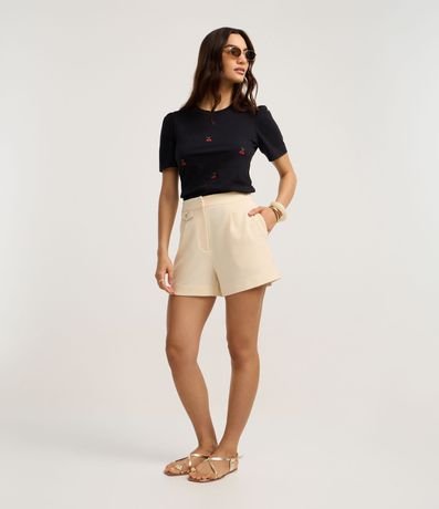 Ref: Blusa slim de mangas bufantes curtas, confeccionada em algodão, com gola redonda e cerejinhas bordadas na parte frontal. Este produto possui algodão certificado BCI em sua composição, além de ter sido produzido através de processos mais sustentáveis, sendo ambientalmente mais responsável.