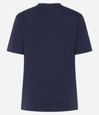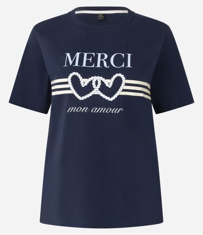Blusa slim em malha de algodão certificado. A blusa tem gola redonda, mangas curtas e estampa estilo nautico com lettering "merci, mon amour".