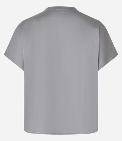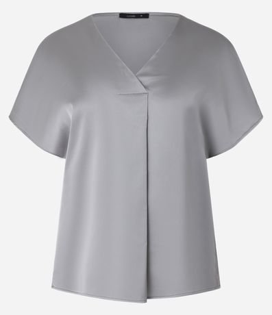 Blusa feminina confeccionada em poliéster e elastano, com acabamento acetinado, decote V e mangas curtas. Sem estampa, seu diferencial está além do acabamento, possuindo prega frontal e não contendo cavas.