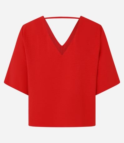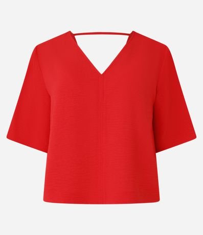 Blusa feminina confeccionada em crepe airflow, com decote V frontal e nas costas, mangas curtas e sem estampa. Possui tirinha entre ombros nas costas.