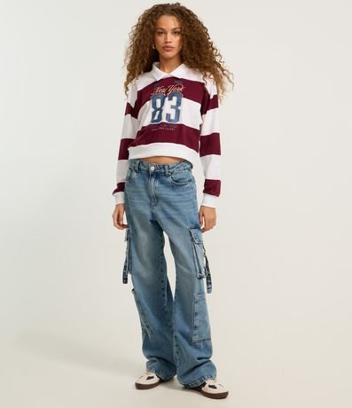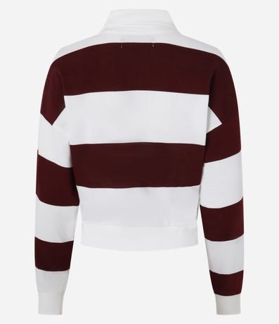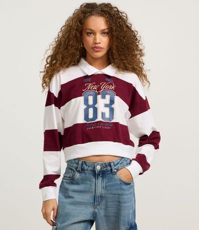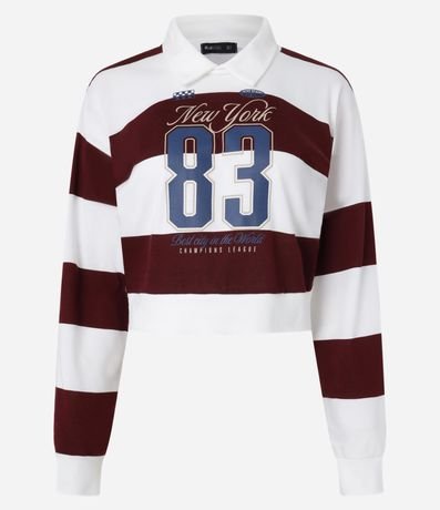 Blusa feminina confeccionada em malha de algodão mais responsável, com gola de lapela e mangas longas. Possui padronagem de listras bold e estampa frontal lettering com tema sportcore.