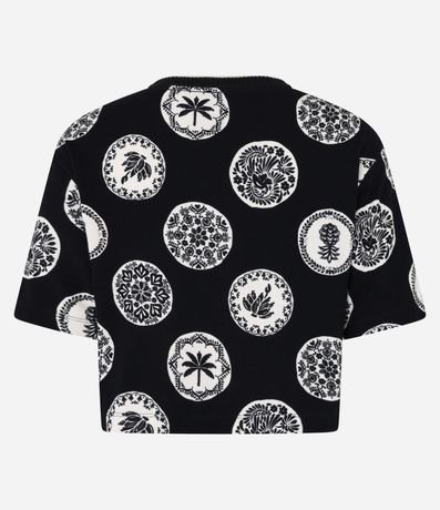 Blusa manga curta, t-shirt com golinha redonda em tricô, confeccionada em viscose mais sustentável e estampa com bolinhas tropicais.