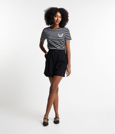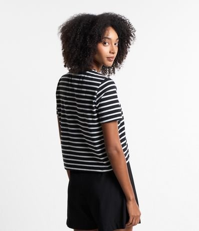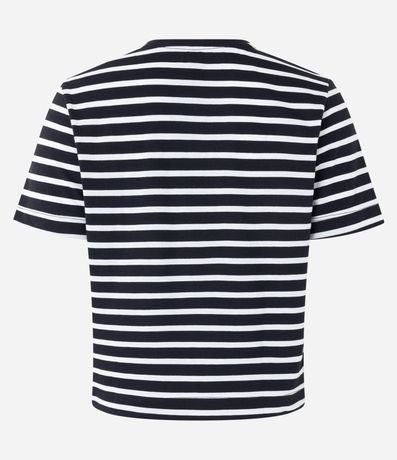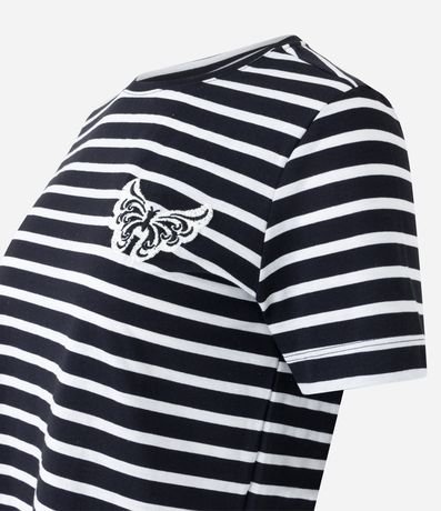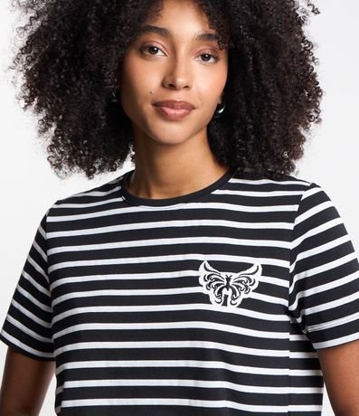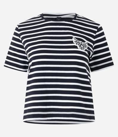 Blusa t-shirt, manga curta, listrada, confeccionada em algodão e com bordado no peito de borboleta.