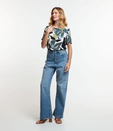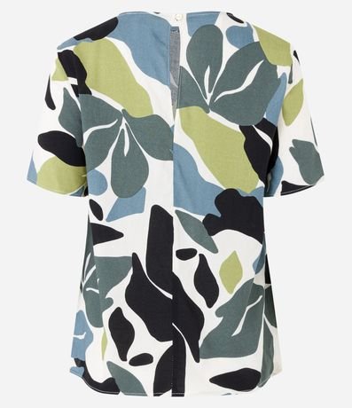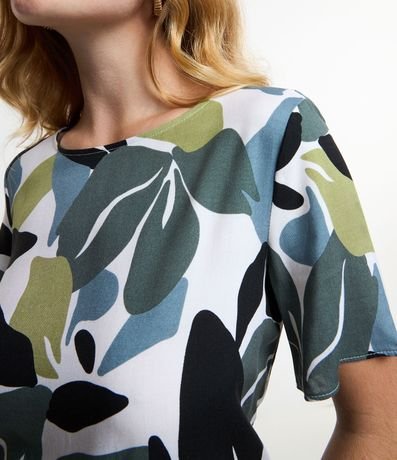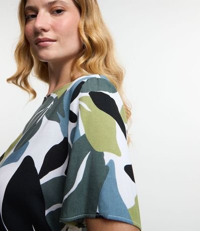 Ref: Blusa t-shirt, manga curta, confeccionada em viscose e com estampa folhas ao vento.
