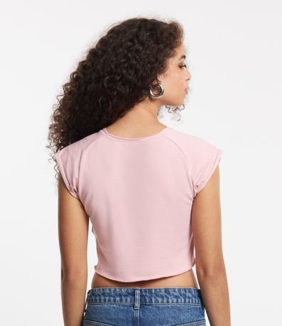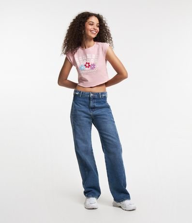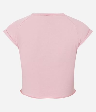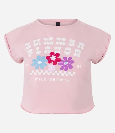Ref: Blusa manga curta, t-shirt, em meia malha e com estampa e lettering e florzinhas.